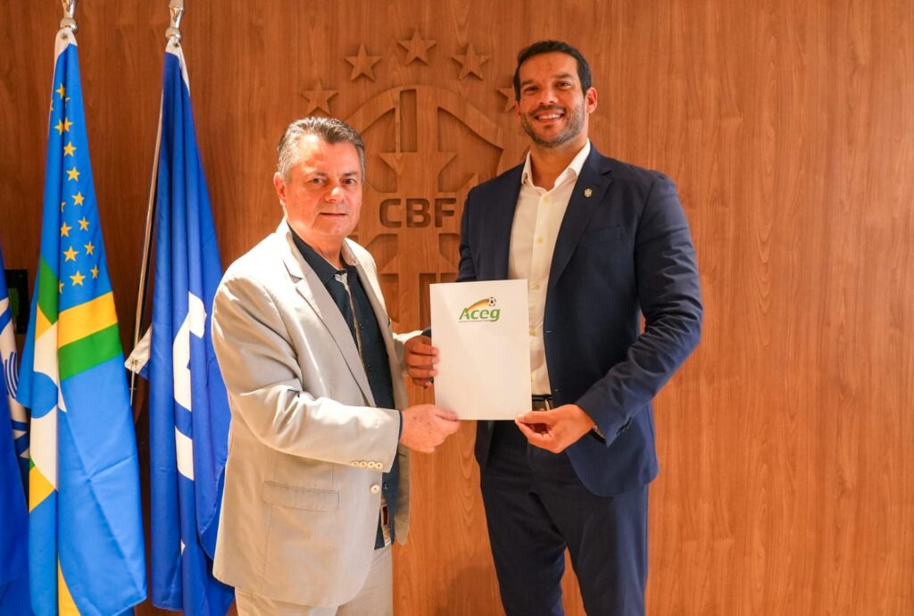 Nesta quinta-feira, 7, o presidente da Associação dos Cronistas Esportivos Gaúchos (ACEG), Rogério Amaral, entregou ao presidente da Confederação Brasileira de Futebol (CBF), Samir Xaud, o convite para participar das comemorações de 80 anos da entidade.