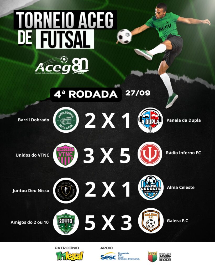 A Copa ACEG 80 Anos chegou à sua quarta rodada no sábado, 27 de setembro, no Ginásio do SESC Protásio Alves, em Porto Alegre, com manhã repleta de jogos movimentados e muitos gols. Ao todo, foram marcados 22 gols nas quatro partidas.