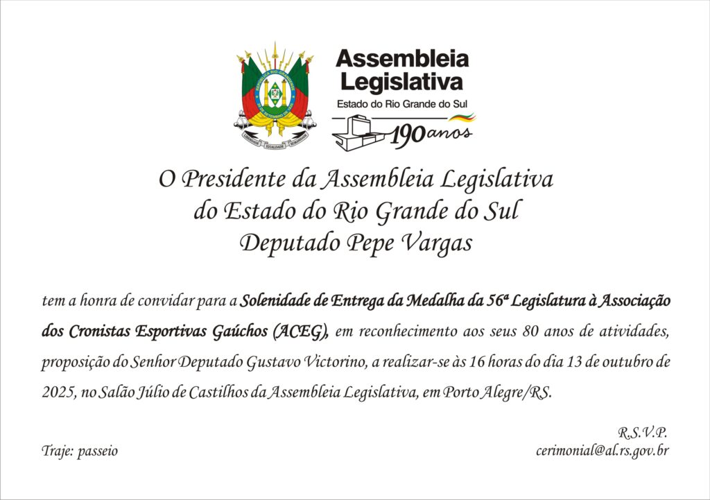 Solenidade de Entrega da Medalha da 56ª Legislatura à Associação dos Cronistas Esportivos Gaúchos (ACEG) setembro 22, 2025 ACEG, Esportes, Noticias Tags: Aceg, Solenidade de Entrega da Medalha da 56ª Legislatura à Associação dos Cronistas Esportivos Gaúchos (ACEG) Postagens Relacionadas Aceg apresenta o projeto “Elas além das 4 Linhas” para o presidente da FGF, Luciano Hocsman Antecipação da abertura do horário do credenciamento do Gre-Nal 450 Aceg apresenta o projeto “Elas além das 4 Linhas” para a secretária extraordinária da Copa do Mundo Feminina 2027 de Porto Alegre